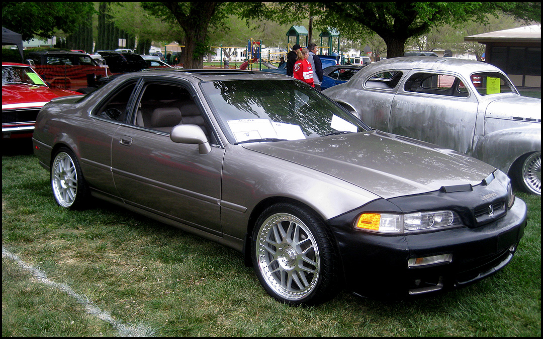My friend Branson and his dad Don have been restoring a 1965 Ford Mustang for the last couple of years and they drove down from Salt Lake City to enter it in its first show, so I decided to throw the old Legend in the show one more time.  Despite the clear coat fade and some rock chips that even the bra can’t cover up, the car cleans up pretty well for its age and mileage!  I displayed the original window sticker, a printout of my maintenance worksheet, and swapped out the dirty “daily” floor mats for a new-in-the-box set that have never been stepped on.  The night before the sh0w, I also installed a set of 19″ Racing Hart C2 wheels that I picked up many years ago and use for shows and special occasions.