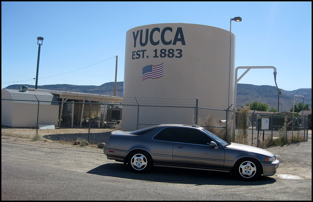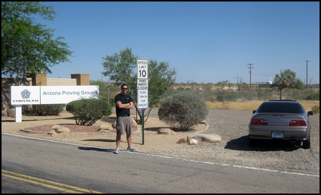 Today’s adventure took my friend Matt and me to the site of the Chrysler-owned “Arizona Proving Ground” in the town of Yucca, which is literally nothing more than a few ghost town-worthy buildings, a post office, a bar, and the expansive proving ground facility which is both heavily gated and closely monitored. In stopping at the entrance to the grounds just off Interstate 40 for a picture, a voice came on a loudspeaker, “Can I help you?” I responded (aimlessly looking around for where the voice had come from) that we were only there for a picture and would be on our way.