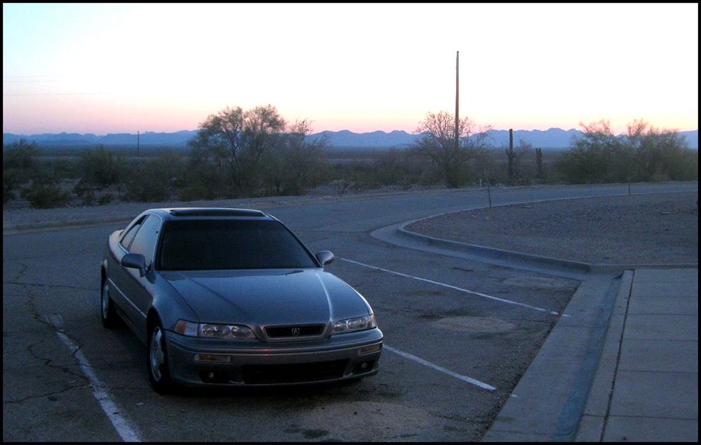 Two more pictures from the drive home. The first captures one of my favorite features on the 91-95 Acura Legend coupe: operational rear windows. Backseat riders always get a kick out of the fact that the little windows go down. Handy for air circulation! This picture was also taken during my absolute favorite time of the day to drive, just before dark. Dusk in the desert is one of the most serene, beautiful settings.