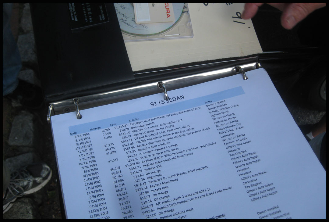 I soon learned that I was far from the only person here obsessed with maintenance & recordkeeping. Alan busted out his binder complete with Excel spreadsheet for his extremely mint condition, sub-100k mile 1991 Legend LS sedan which I had the privilege of taking for a spin today.