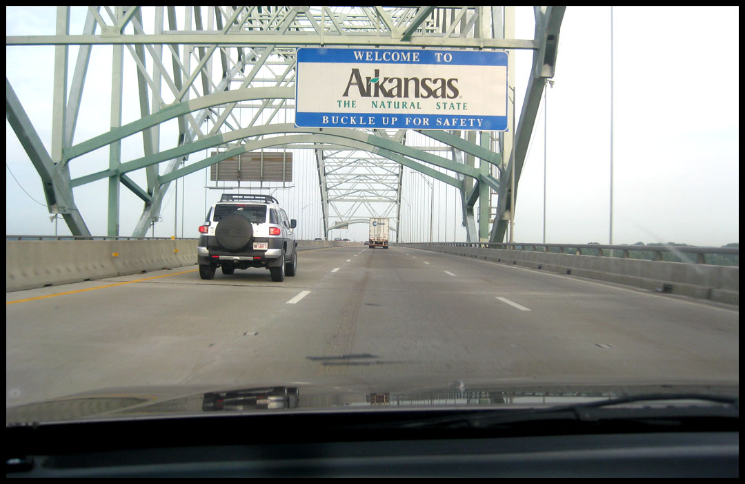 Only about 70 miles down the road, I went through Memphis (and thankfully, didn’t hit rush hour too badly). The Arkansas welcome sign is on a 3-lane bridge with no shoulder that crosses the Mississippi River, so the best I could do for a picture was this drive-by.