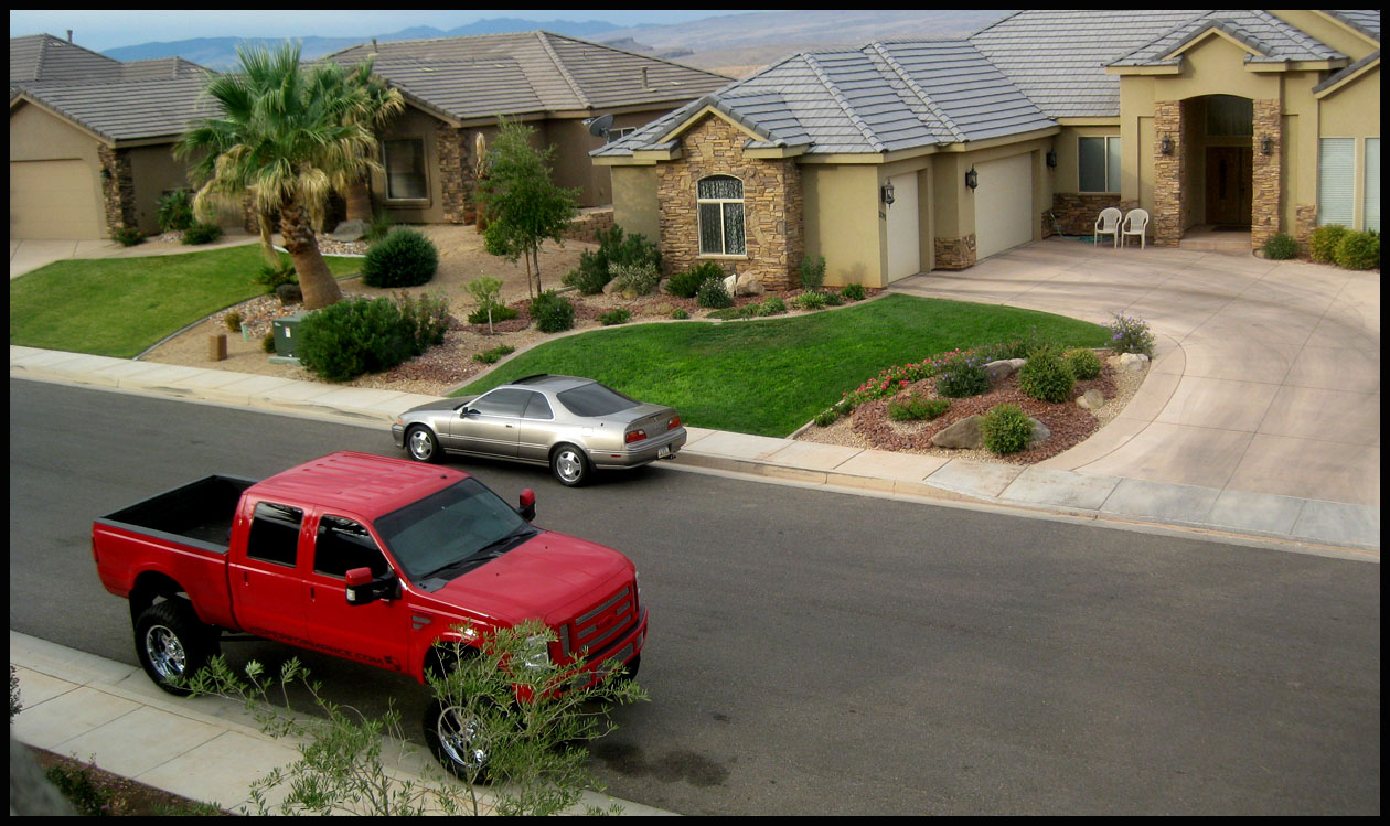 My brother rolled out the red carpet for a stay at his home in St. George. Here’s the view of my Legend along with his 2008 Ford F-250 “Big Red” as seen from the bathroom window. Notice that I park far away from the truck with its 40″ tires and 22″ rims so that it doesn’t inadvertently roll over and crush my car, monster-truck style.