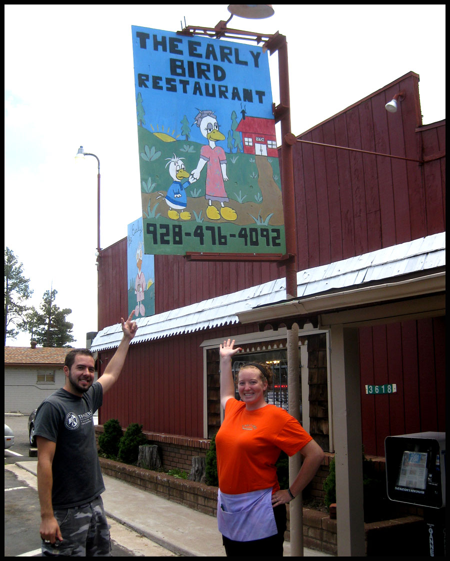 I ate at The Early Bird Restaurant in Pine, Arizona. The buffalo chicken sandwich with a side of cottage cheese is highly recommended. It is quite a change to eat at a place where the server calculates the total due for each guest check using an actual old-school calculator! That was the case here. “Katie” obliged for a photo prior to my departure. Great staff!