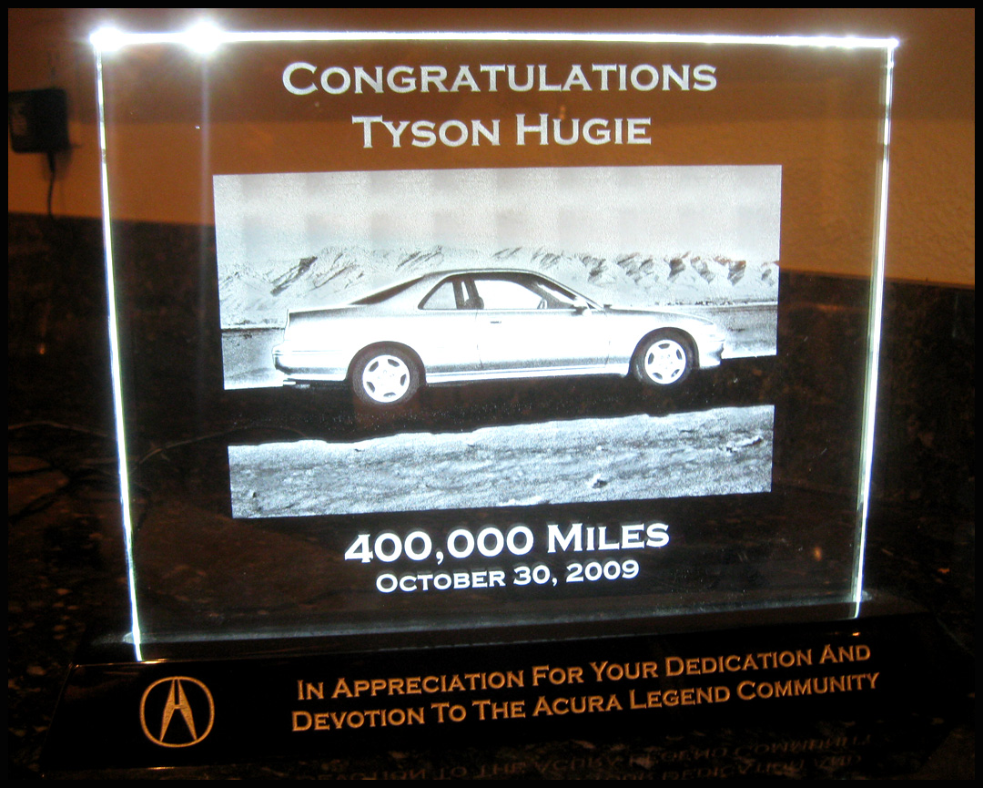 I was reminded tonight about an anniversary that will be coming up in just a little over a month.  It was 10/30/09 – almost exactly two years ago, that I rolled 400,000 on the Legend on my way to Las Vegas.  My friends at the Acura Legend forums presented me with an etched LED plaque that to this day is the prominent feature on my kitchen counter.  It’s proudly displayed as a conversation piece for any who visit my home!