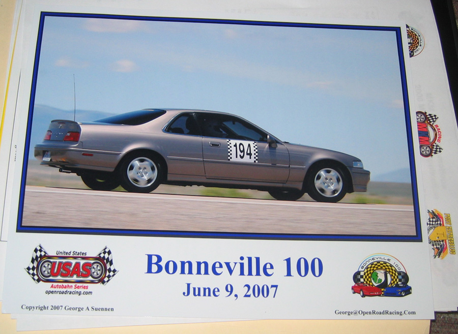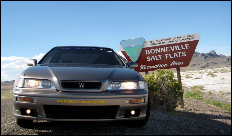 It had always been a dream of mine to drive my own Acura Legend, flat out, on a public highway as fast as I wanted to. I had that opportunity for two consecutive events at the Bonneville 100 Open-Road Race, put together by an organization called MKM Racing. The premise of the B100 is to fly down a (closed) public highway for 100 miles (50 miles down, then 50 miles return) and arrive at the finish line at exactly your target average speed. The race is held about where the “A” on this map is located — in the barren reaches of the Nevada/Utah desert near the Bonneville Salt Flats.