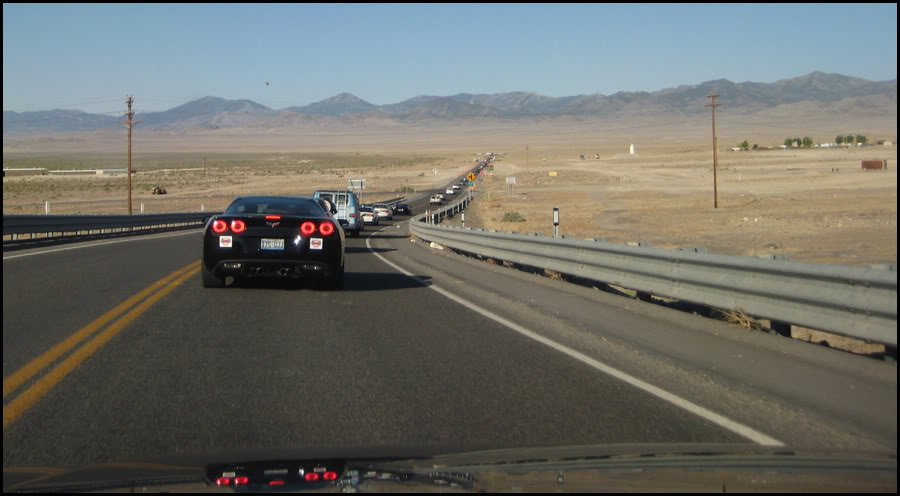 This is the caravan to the start line on Highway 93 where the race is held. Mike, a competitor from Las Vegas in the 105 mph class and now a good friend of mine, was ahead of me in his black 2007 C6 Corvette 6-speed.