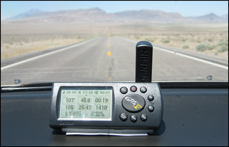 Here you can get an idea of the somewhat primitive GPS system that Branson and I relied on during the race. Top left number is current speed. Bottom left number is average speed. This picture was taken on a 7-mile straightaway that was called the Speed Trap. The yellow blob you see up ahead is a competitor in my 105 mph class in a C6 Corvette. We were gaining on him.