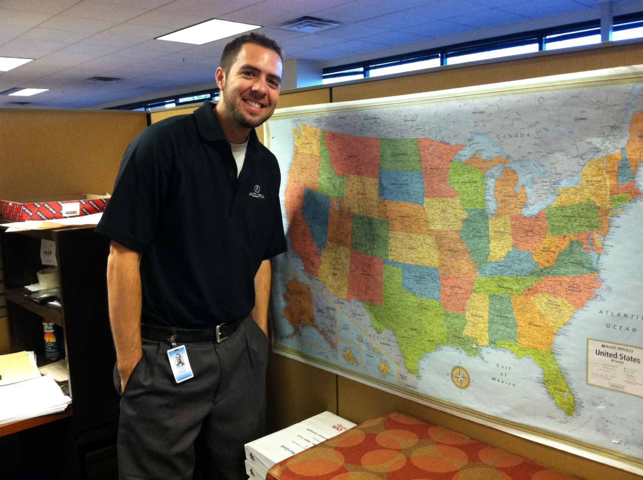 Since I do get asked quite a bit: My career is in the pharmaceutical biz. I work as an analyst for a pharmacy benefit management company called CVS Caremark based in Scottsdale, Arizona. The most important tool at my disposal in my cubicle at the office is a U.S. map because I zone out frequently while daydreaming of road trip opportunities. My colleague Michelle snagged this picture today. I happened to be proudly wearing an Acura Polo shirt, too.