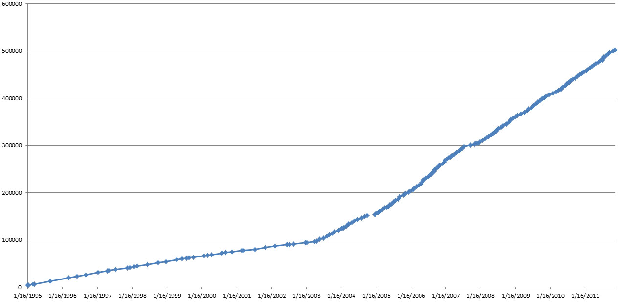 I thought it would also be interesting to again plot out my car’s mileage history in visual form. Its life sure changed in the first part of 2003!