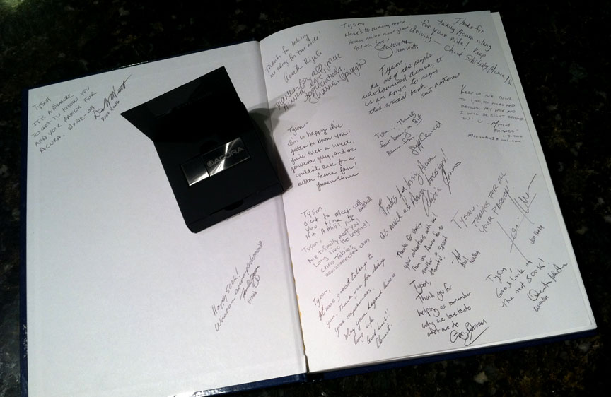 Below is my photo with Kurt Antonius, Assistant Vice President of American Honda Motor Co. I was having him (and a number of other Honda & Acura important people) sign the inside cover of my hardback copy of the “Drive to Five” blog.