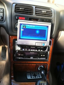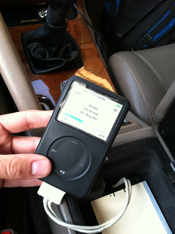 When I first took the iPod plunge by purchasing my gigantic 80-gig “Classic” model, I immediately needed a way to take my tunes with me on my many cross-country road trips. My brother who is an electronics genius hooked me up with a pretty advanced setup for its time – a Pioneer CD/DVD/pop-out screen setup that gave me iPod compatibility. In its day, this was a pretty cool setup. He even ran the auxiliary wire through to the center console so it’s out of sight.