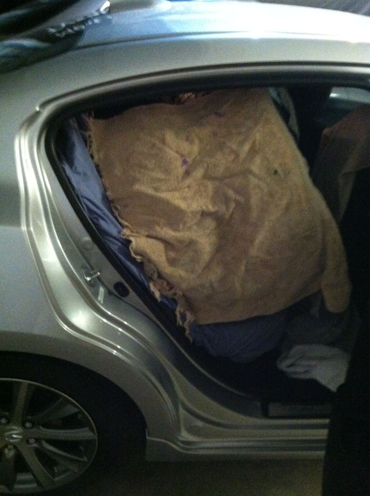 • The passenger side turn signal light that’s held in the bumper by duct tape.