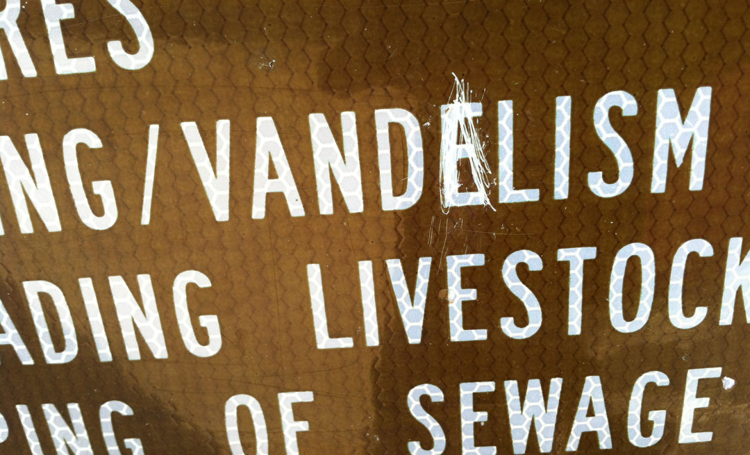 Among the list of prohibited activities: Vandalism. Except, whoever developed this sign misspelled “vandalism” with an E.