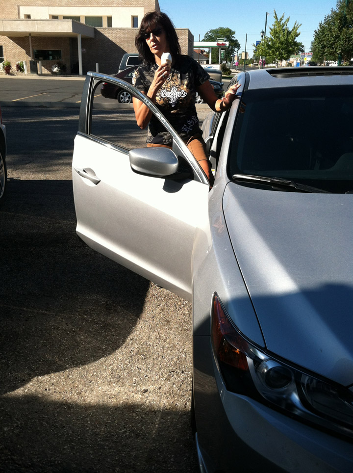 Bathroom break and a chance to validate our directions. It’s a good thing we stopped, in fact, because for a short time we’d been traveling the wrong way. Though they may not be highly visible in this shot, my cousin Dillon (in front of the Dodge) is facing probably a dozen cows that were creeping closer to us.