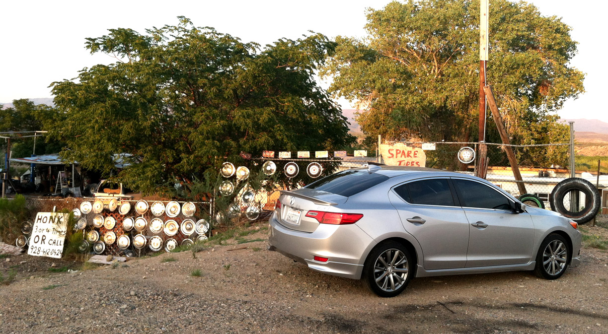 Wikieup Auto Repair. Wikieup, Arizona. If you want their attention (per the sign to the left of the picture), you’ve got to “Honk 3 or 4 Times. Or Call.” Anyone need a spare hubcap or two?