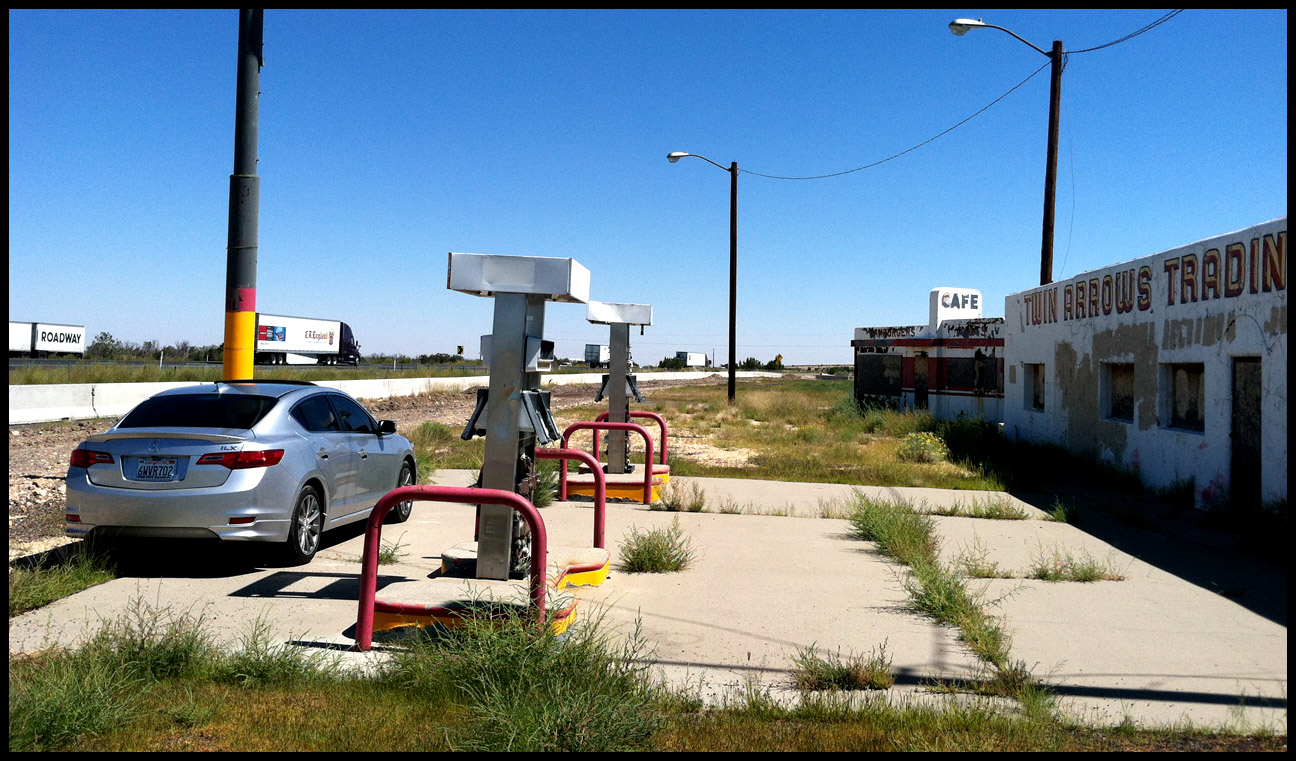 In 2003, concrete barricades (visible in the background of the above picture) were installed along the frontage road preventing access to the site. However, I was able to drive around the barricades about 1/2 mile up the road and back-track on a dirt road to get to Twin Arrows for a closer picture.