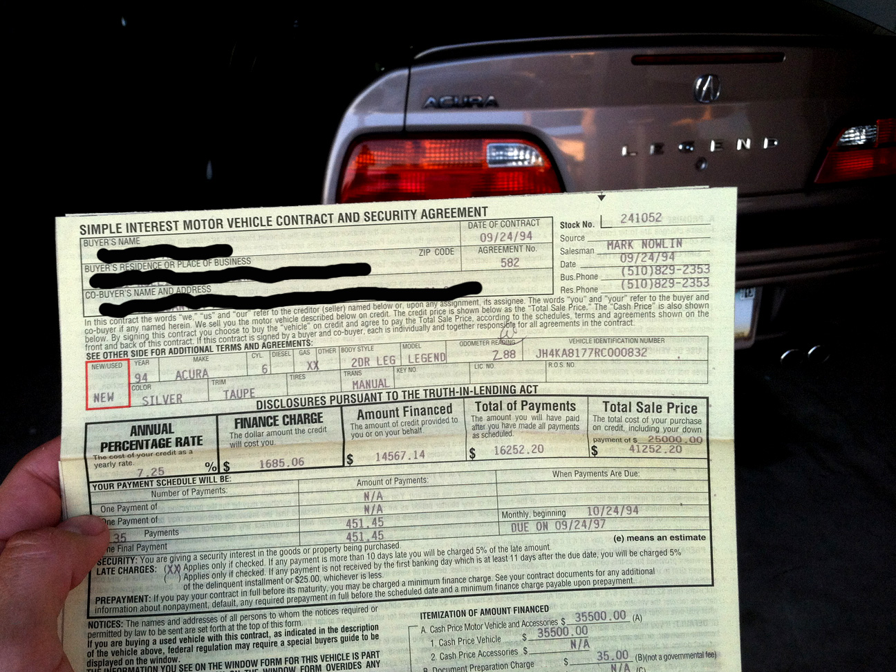 Tomorrow, 9/24/2012, will mark the 18-year anniversary of the date that my 1994 Legend LS coupe was purchased new by its original owner in Pleasanton, California with only 288 miles on the odometer. I was lucky enough to score all of the original Bill of Sale paperwork when I bought the car in early 2003.