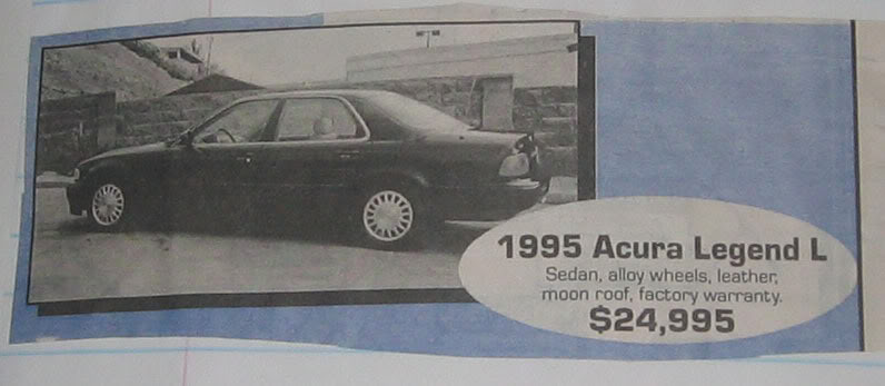 Here’s one that I saved from the Pioneer Shopper want-ads in St. George, Utah dated about 1998.  This black Legend was for sale at a dealership called St. George Motorcars.