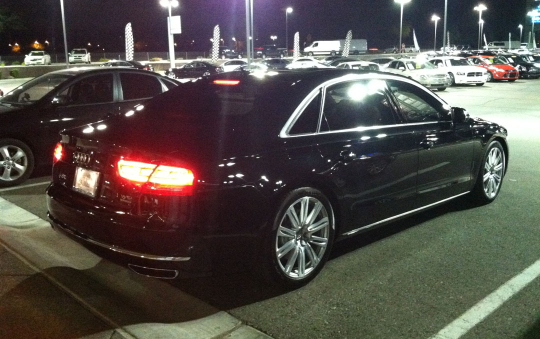 Since I had a bit of time to kill while Aaron took care of paperwork, I watched another gentleman take delivery of the below car, a 2013 Audi A8L. This monster is a 500-horsepower, 463 lb-ft of torque luxo-ride powered by a W12 motor. The pricetag? Only $154,000.