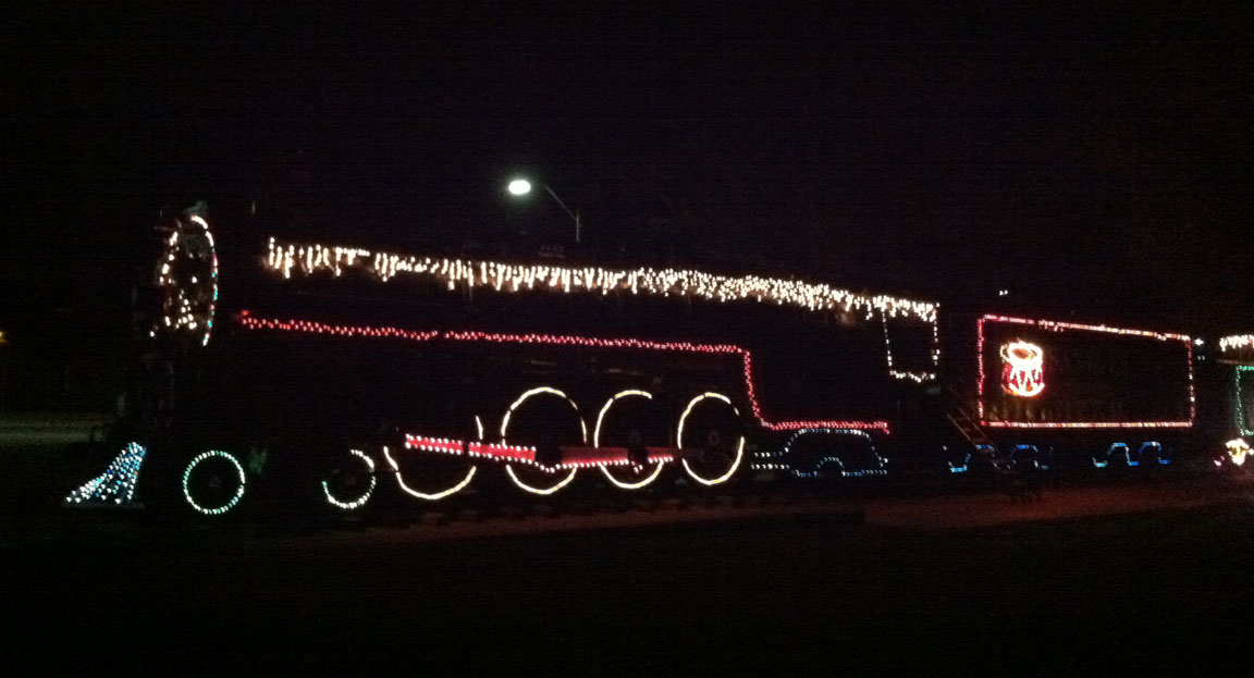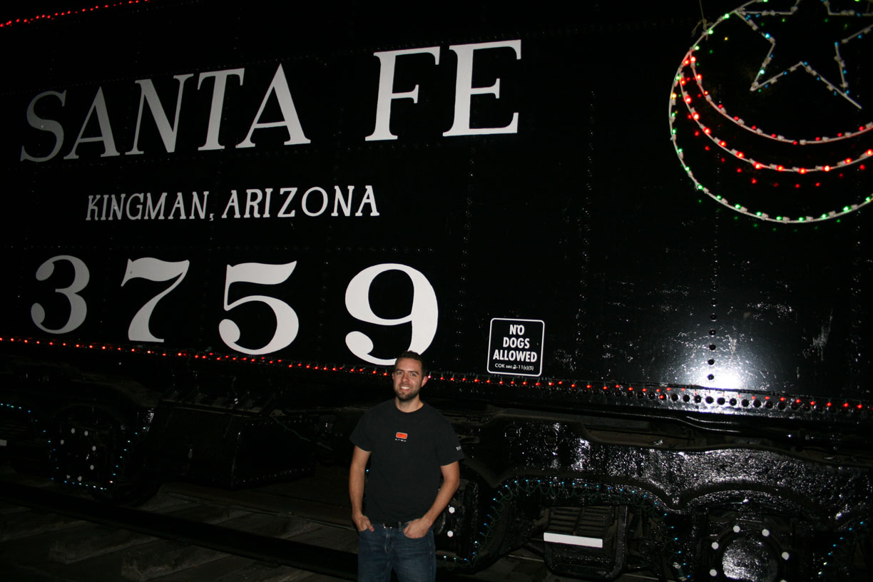 Across the street, a 1928 steam locomotive was on display. This one was Santa Fe #3759 – a “4-8-4” style that was built in 1928 and ran until 1957 when it was donated to the city of Kingman.  It’s sat in its current location for 55 years!  The locomotive reportedly ran 2.5 million miles of service before its retirement.  Now that’s something a half-million miler like me can appreciate!  Each year during this season the train is decorated with Christmas lights so I got a few pictures before continuing on my way.