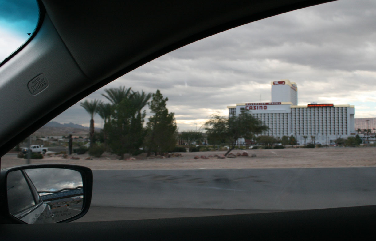 When I approached Hwy 163, I headed toward Laughlin Nevada.  The road drops sharply in elevation toward the Colorado River in the valley below.  Laughlin is the third most visited casino and resort destination, after Las Vegas and Reno.  I did not pit stop here but did snag a picture of the Riverview Casino out my passenger window.
