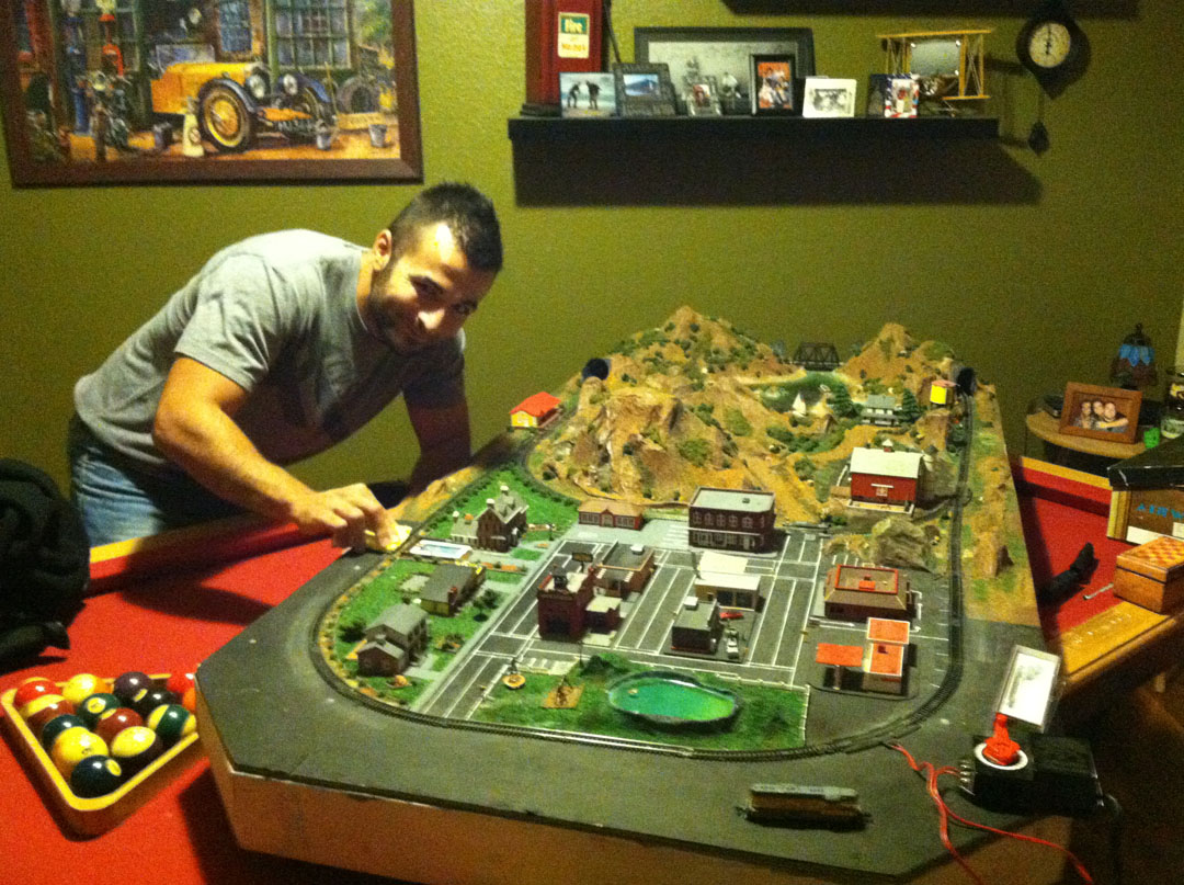 When my dad drove down to Phoenix on Wednesday, he brought my old N-Scale train set.  My grandma and I put this masterpiece together back in 1996 when I was 14-15 years old.  It has paper mache mountains, a resin lake, two tunnels, and even illuminated buildings in the “town” (which I named Tysonville).  I dug out the diesel locomotive to see if it still worked.  Sure enough!  Looks like I was putting miles on toy train sets long before I was driving the wheels off a car.