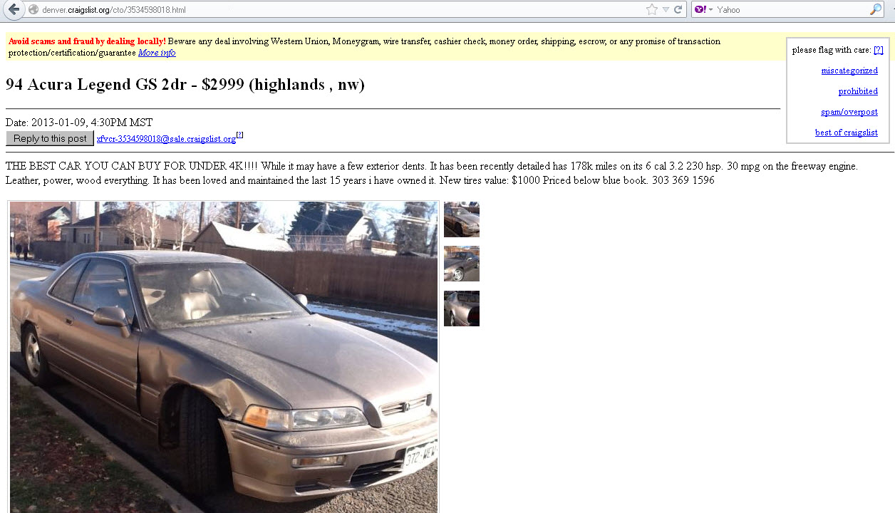 Anyone else find the below craigslist ad a little sad?  It’s for a Desert Mist Metallic Legend like mine but with only 178k miles.  This Denver car looks like it has seen better days, yet the owner states it has been “recently detailed” as well as “loved and maintained” for the last 15 years they’ve owned it.  Does this look like an Acura that’s been loved?