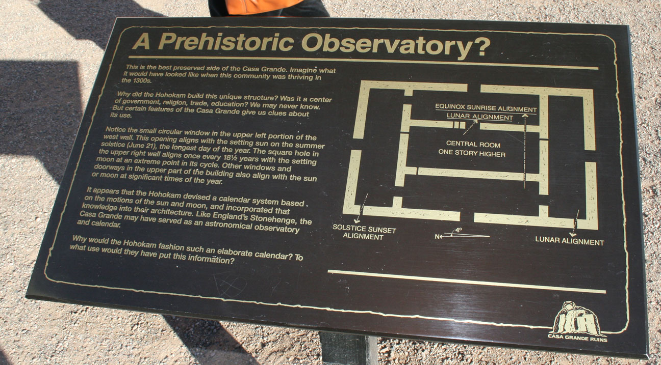 Certain features of the Casa Grande ruins align with the belief that this was a prehistoric observatory.  Certain openings/windows in the structure align with various notable times of the year, like a window at the upper left corner of the west wall that aligns with the setting sun on the summer solstice (June 21).