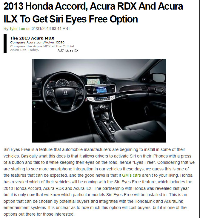 Acura continues to be at the forefront of innovation when it comes to driver safety and convenience. This week, it was announced that the ILX is one of Honda/Acura vehicles that will offer integrated support for the iPhone’s “Siri.” With just the activation of the hands-free link and Bluetooth, drivers may now keep their eyes on the road and utilize Siri functionality. From a press release dated 1/30/13:
