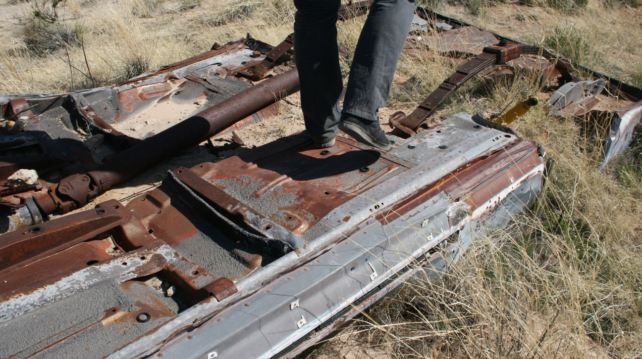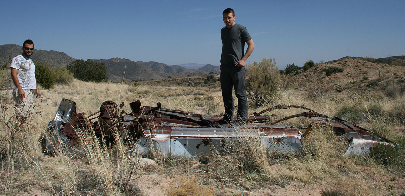 Matt and Justin, climbing on/around the overturned vehicle trying to identify it. I’m guessing it’s from the 1960s.