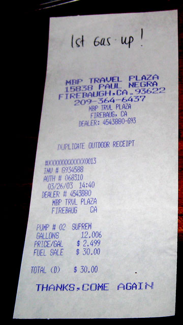 My first fuel up when I bought the car was at the “MBP Travel Plaza” off I-5 in Firebaugh, California.  I paid $2.49 for Chevron Premium.