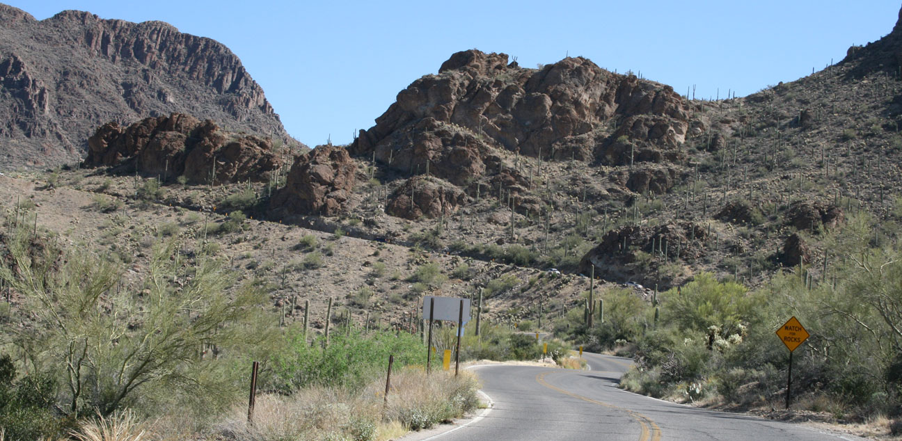 Saguaro cacti thrive in this dry, desert environment. Speedway Boulevard soon slimmed down to 2 lanes from 4, and I started seeing warning signs for Gates Pass.