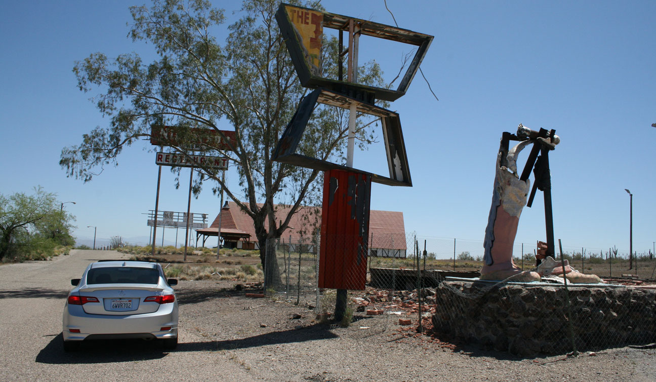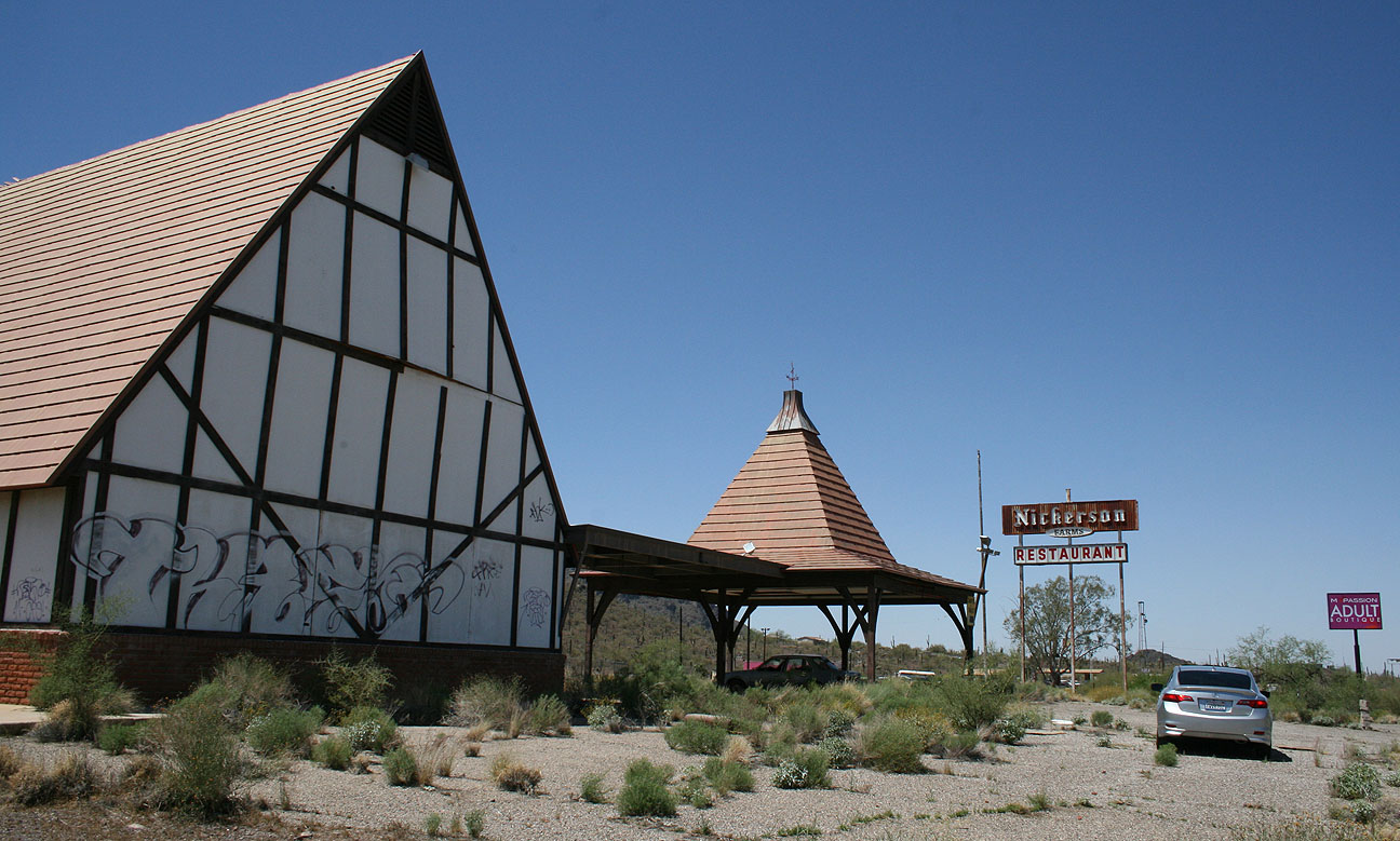 There was just one more place that I wanted to check out on today’s adventure: Nickerson Farms Restaurant in Picacho, Arizona off Interstate 10. After having inhaled that turkey sandwich at Old Tucson not long before, I was far from hungry. But Nickerson isn’t the place I’d go to satisfy my appetite anyway. You see, the restaurant’s been closed for over 30 years.
