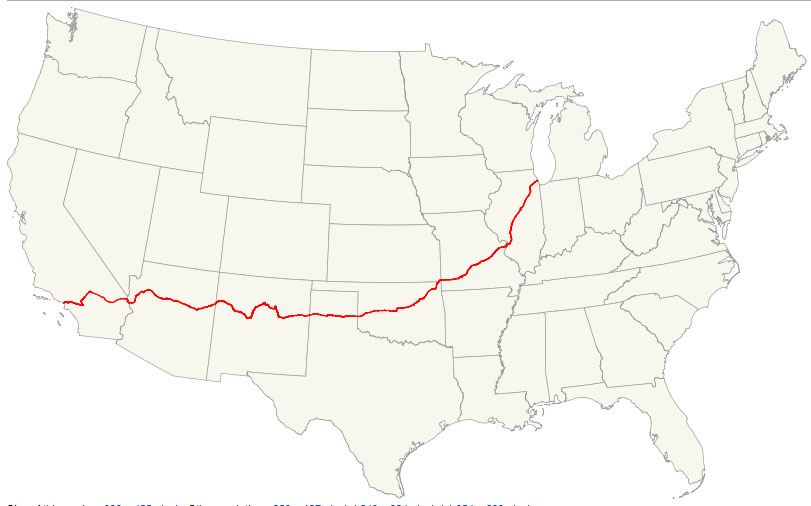 For this weekend’s ILXcapades, we find ourselves venturing back to the heyday of automobile travel as we know it. Route 66 – the “Mother Road” – has long been known as the most talked-about corridor in popular culture. Its entire length ran about 2,400 miles from Chicago to Los Angeles, but the road was decommissioned 28 years ago in the mid-1980s. This is a map of the original route.