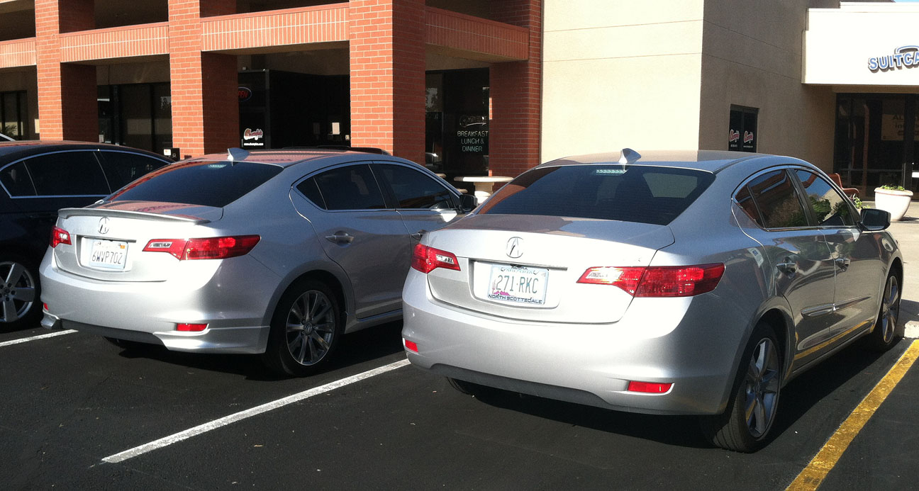 Hooray!  A twin encounter at last.  For the first time in the nearly 11 months since I got the key to my new 2013 Acura ILX, I was able to park next to a car that looked exactly like mine (well, minus a few accessories) on Tuesday afternoon.  At a strip mall in Scottsdale, Arizona, I pulled up next to this Silver Moon Metallic 2.0 automatic ILX.