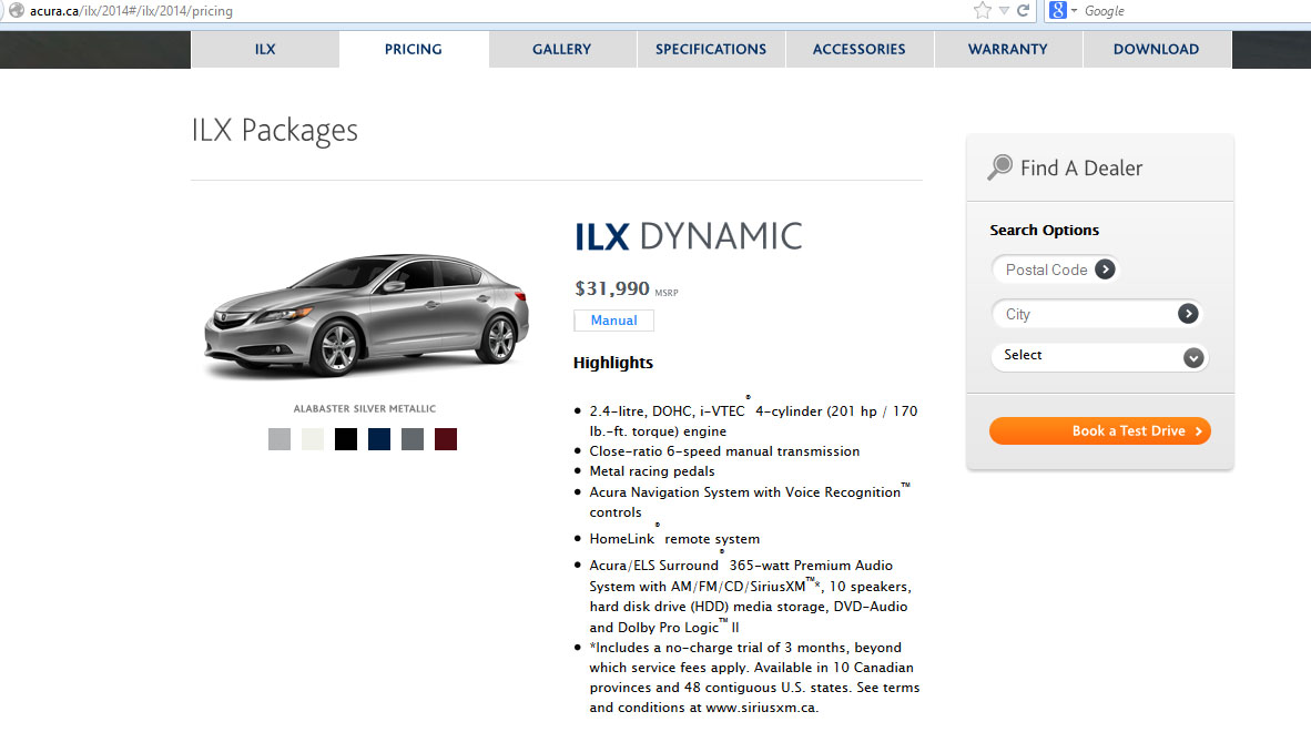 There’s exciting news in Canada:  The 2014 ILX is now available for “Build & Price” on Acura Canada’s website, and there are some exciting updates for the car’s second model year.  Canadian ILXs may now be equipped with a navigation system as well as the 6-speed drivetrain. These two features had previously been mutually exclusive.