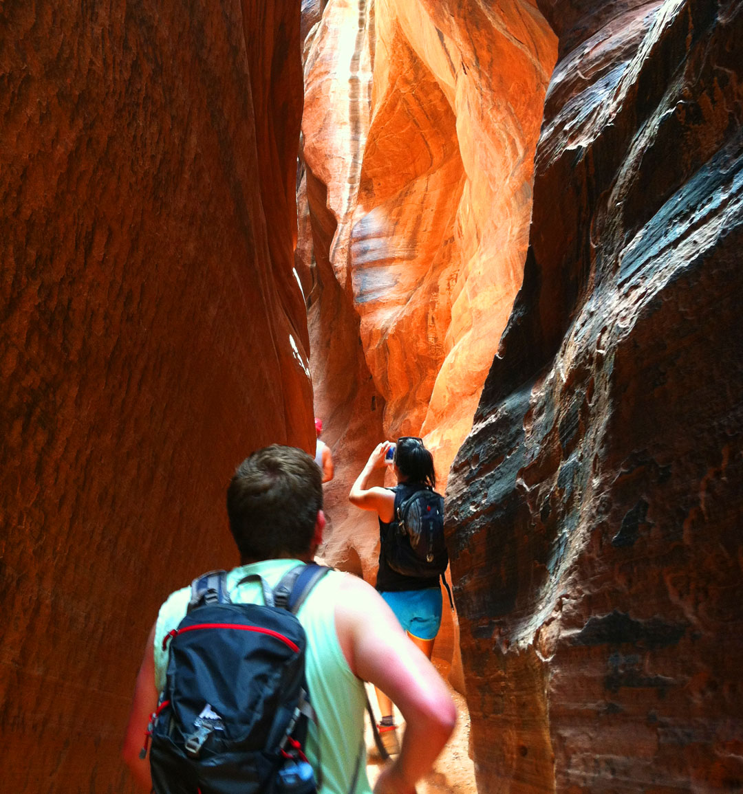 The canyon’s length is 13 miles and there’s only one place where hikers can exit mid-way through (called, appropriately, Middle Trail). That means once you’re in the slot canyon, there’s no way out for at least several miles. Here, Cathy and Rustin are leading the way through one of the very narrow sections. Can you imagine a wall of water coming at you if a flash flood happened here?