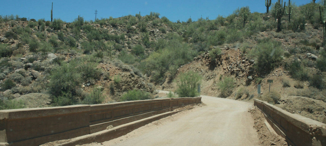 For the next 22 miles, we curved around rocks & rivers as we made our way toward Roosevelt Lake on the graded dirt road.