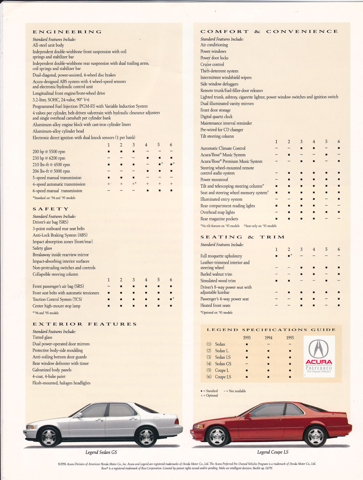 It’s kind of fun to read the specifications for the Legend Coupe & Sedan from a “Preferred Pre-Owned” brochure.