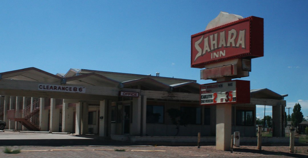 Sahara Inn. I thought for sure this place was long-since closed, but a look on Trip Advisor reveals that it’s still in business. It’s rated #15 out of 18 hotels in Holbrook, though. Be advised!