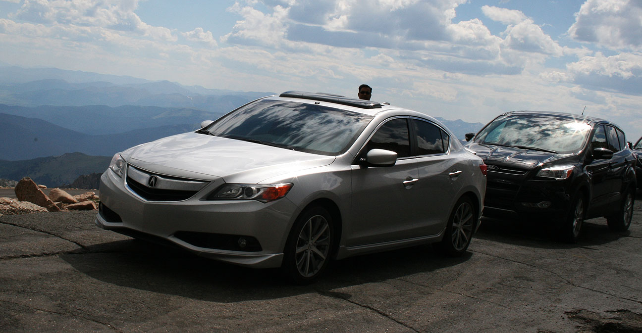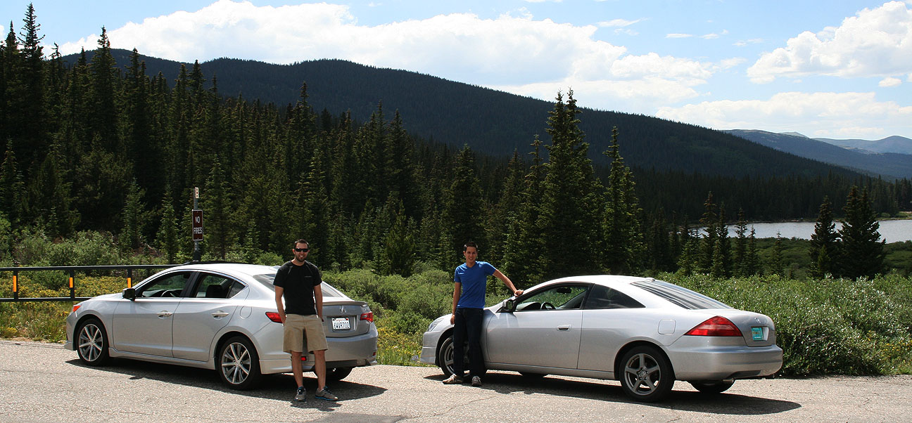 Echo Lake, at 10,600 feet, lies in the background in the below picture and marks the start of the 14-mile road that leads to the summit of Mount Evans. The Accord and the ILX had driven a combined 1,800 miles to get to this point. Even without a car wash, our silver paint jobs hid the bugs and dirt well.