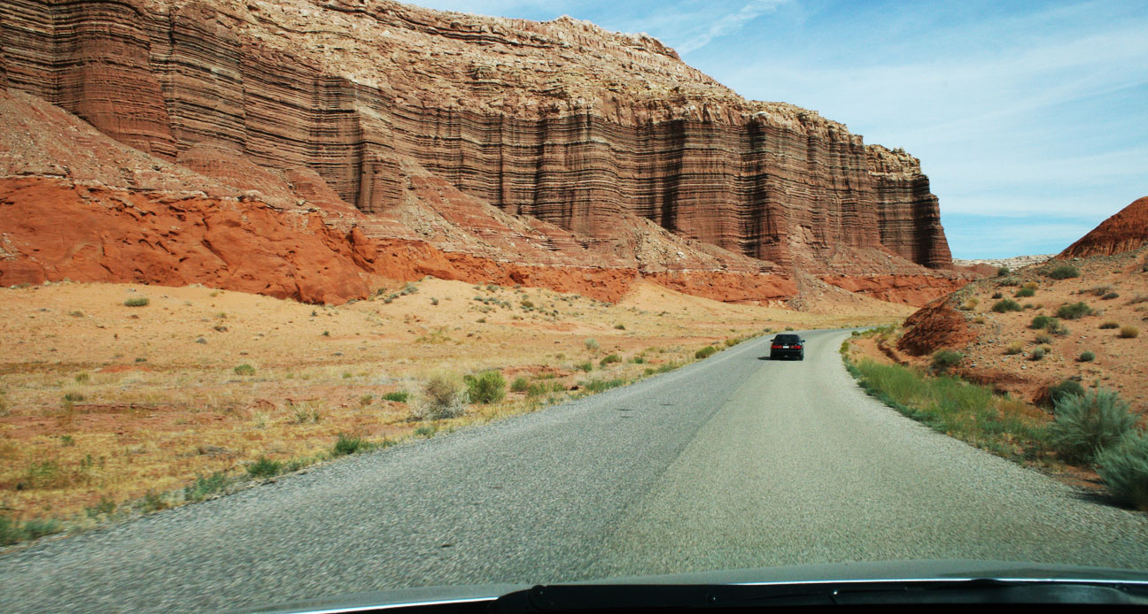 A bit further up the road, Ryan and I entered the park boundary for Capitol Reef National Park. Unlike most other national park entrances, though, this one has no entry fee. It’s so remote that it isn’t even staffed. There’s a small signpost which reads “PARK INFORMATION” and holds a wooden box containing brochures.
