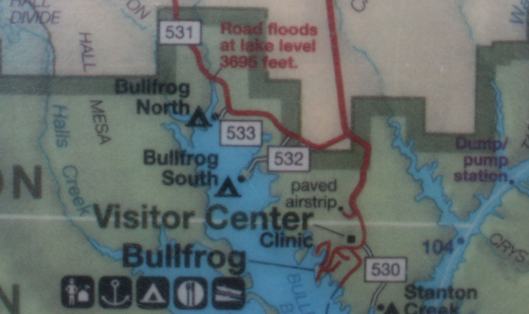 Just a little ways into the drive, our plans were nearly foiled. There’s a part of the Burr trail that floods when the lake level exceeds a certain measurement (3,695 feet, to be exact). See the note here in red on a map: