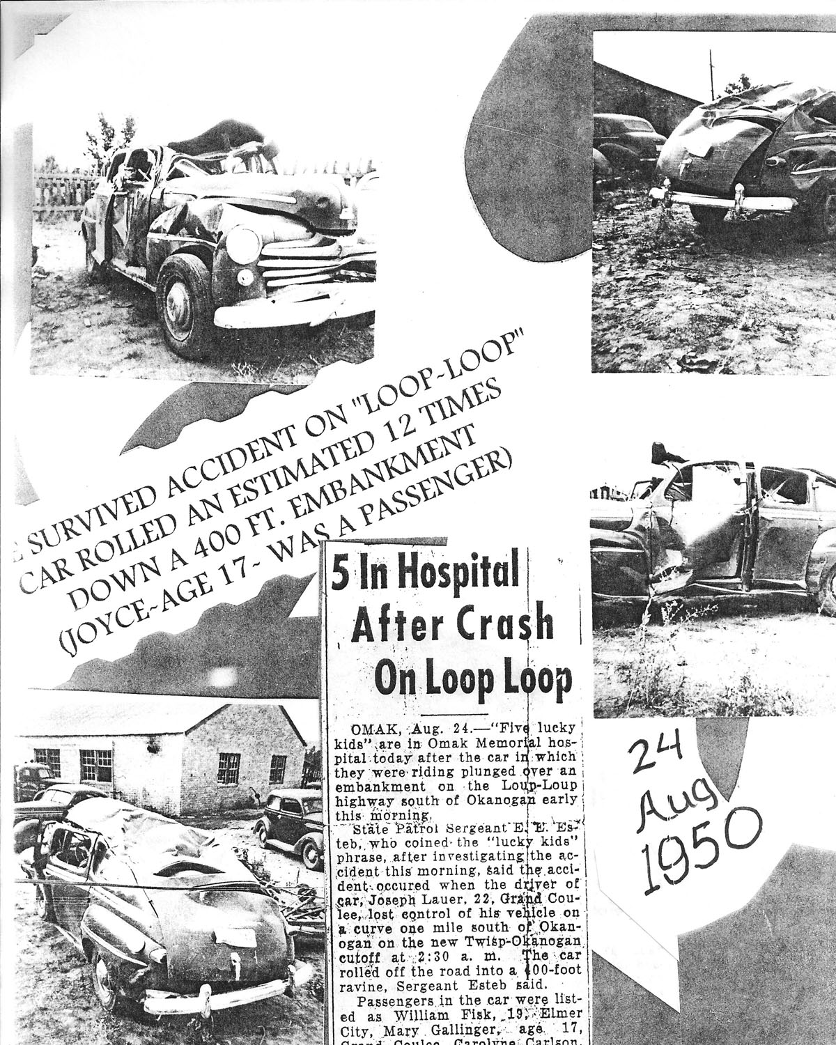 Our next destination was perhaps a bit odd in purpose, but still very worthwhile and meaningful.  In the early morning hours of August 24, 1950, my grandma was involved as a passenger in an auto accident just south of the town of Okanogan, Washington.  The car in which she rode soared up a hill at 85+ miles per hour and plunged off an embankment.  Miraculously, even after the car rolled an estimated 12 times, she was able to climb to the main road and seek medical attention.  Below is a newspaper article and a few pictures of the vehicle.