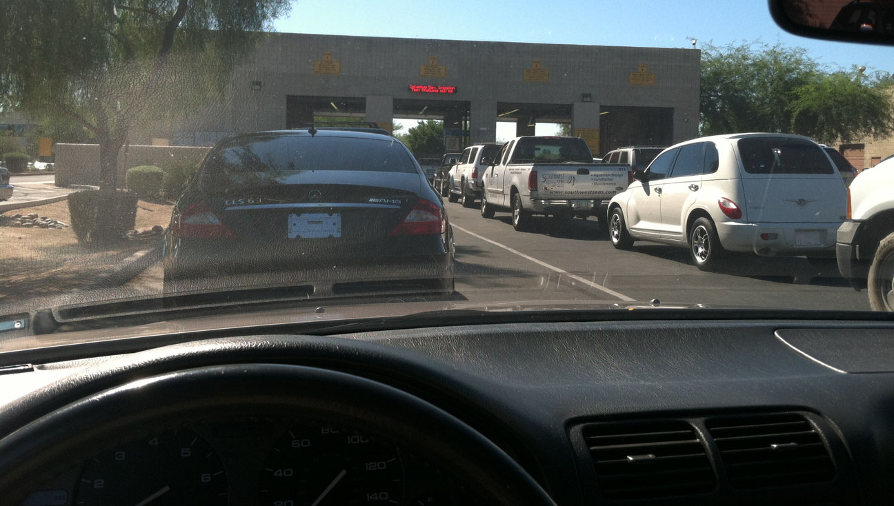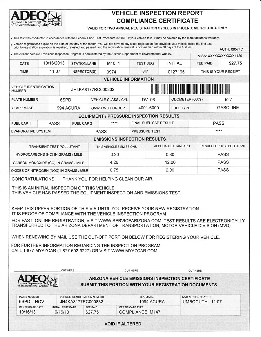 I instead went to the ADEQ (Arizona Department of Environmental Quality) emissions check station near my work and waited in line with the car for about 15 minutes before having the test performed. The fee of $27.75 has been the same since I moved to Arizona in 2006. I was sent on my way with a VIR (Vehicle Inspection Report). Then, I went online and paid $108 for a 2-year renewal. Done-zo.