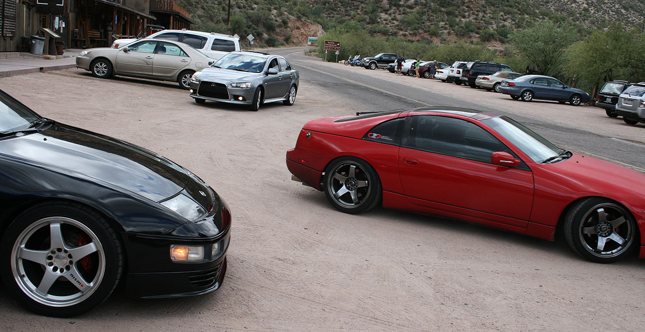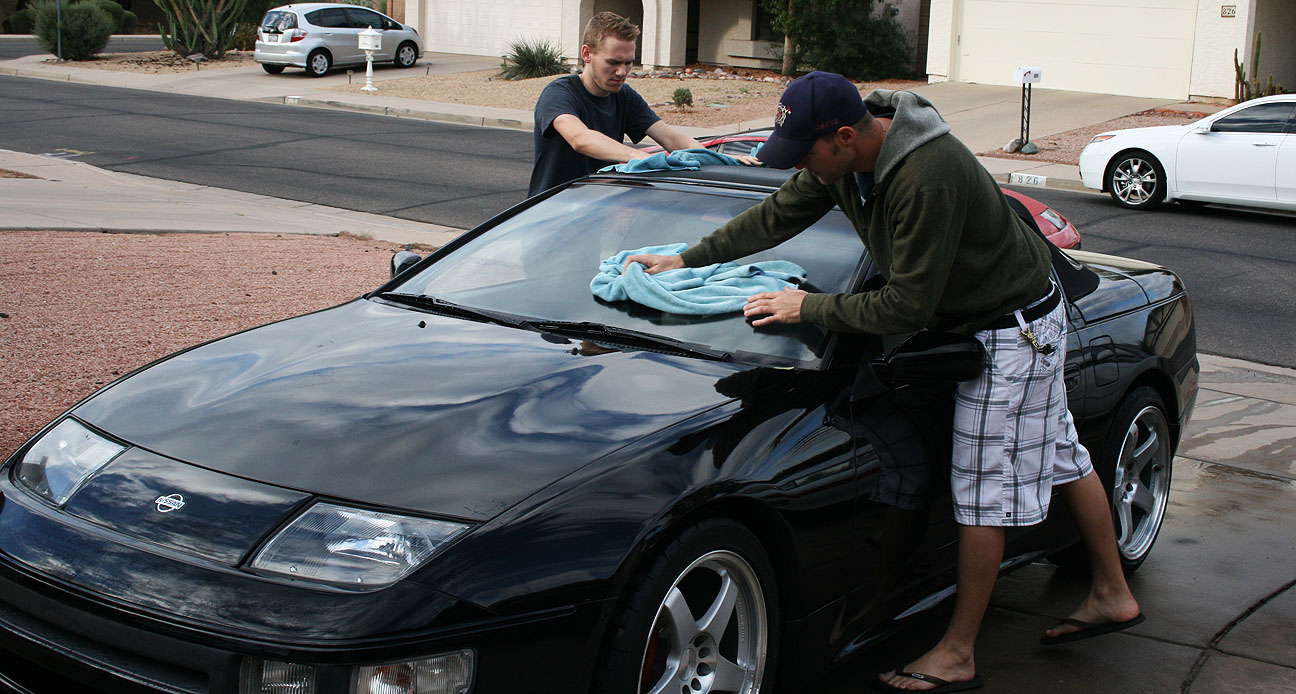 Washing cars before the drive. Only a true car fanatic would do such a thing. Nick and Kurt wiping down the Nissan 300ZX convertible.