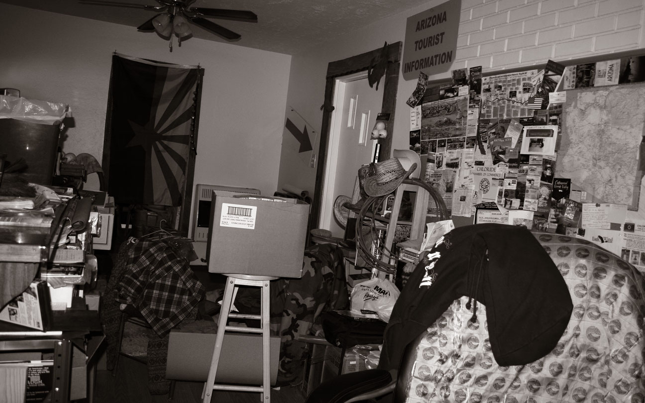 The sign at hanging on the wall at right reads, “Arizona Tourist Information.” Good luck finding it in this disastrous room.