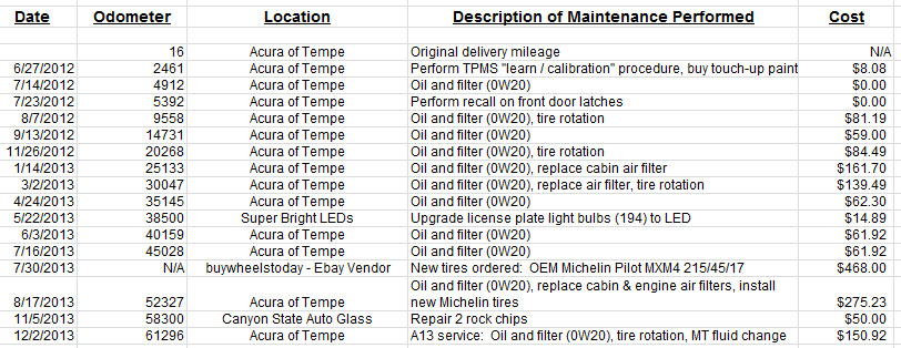 My last oil change in the ILX was on August 17th, 2013 at 52,237 miles. At 61,016 miles (8,689 miles later!), the “Maintenance Minder” popped up and alerted me that remaining oil life was at 15% and instructed me to schedule an A13 service. I spoke on the phone with Acura of Tempe and learned that an A13 includes oil and filter change, tire rotation, and replacement of the transmission fluid. I’m scheduled for that service tomorrow.