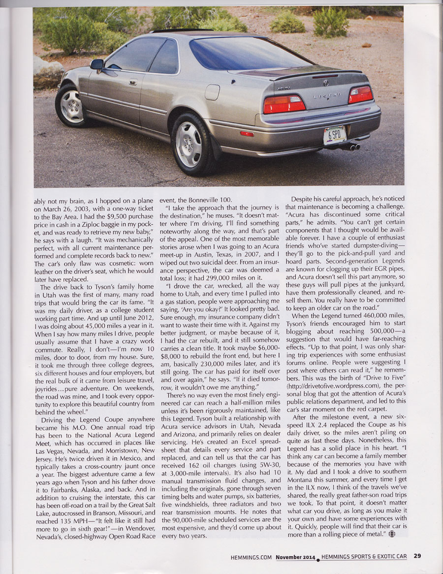 My 1994 Acura Legend coupe was featured along with two other cars:  A 1972 Citroen SM and 1984 Volkswagen GTI.  Each vehicle has achieved impressive mileage thanks to diligent care & maintenance over the years.