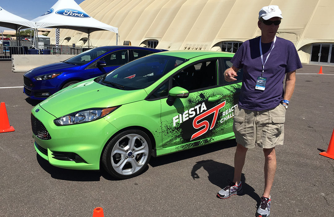 We were instructed to rev the tach to 3,000 RPM for take-off, and I followed those instructions to a T.  The Fiesta spun its wheels just momentarily on take-off but got a grip quickly and I was on my way.  Steve and I blasted in parallel through first gear to the red flag at the end of the very short runway, then clamped down on the brakes.  A digital readout displayed our respective reaction times.  My personal best was a .43 and I think Steve was somewhere in the 5’s.  Following that straight section, there was a curvy section lined with orange cones and then another slalom.  The Fiesta is very light on its feet and I had a blast tossing it around.  The surprising part was that the larger Focus ST actually didn’t feel nearly as fun.  Steve and I agreed on that.  Each of us took two laps in each car.